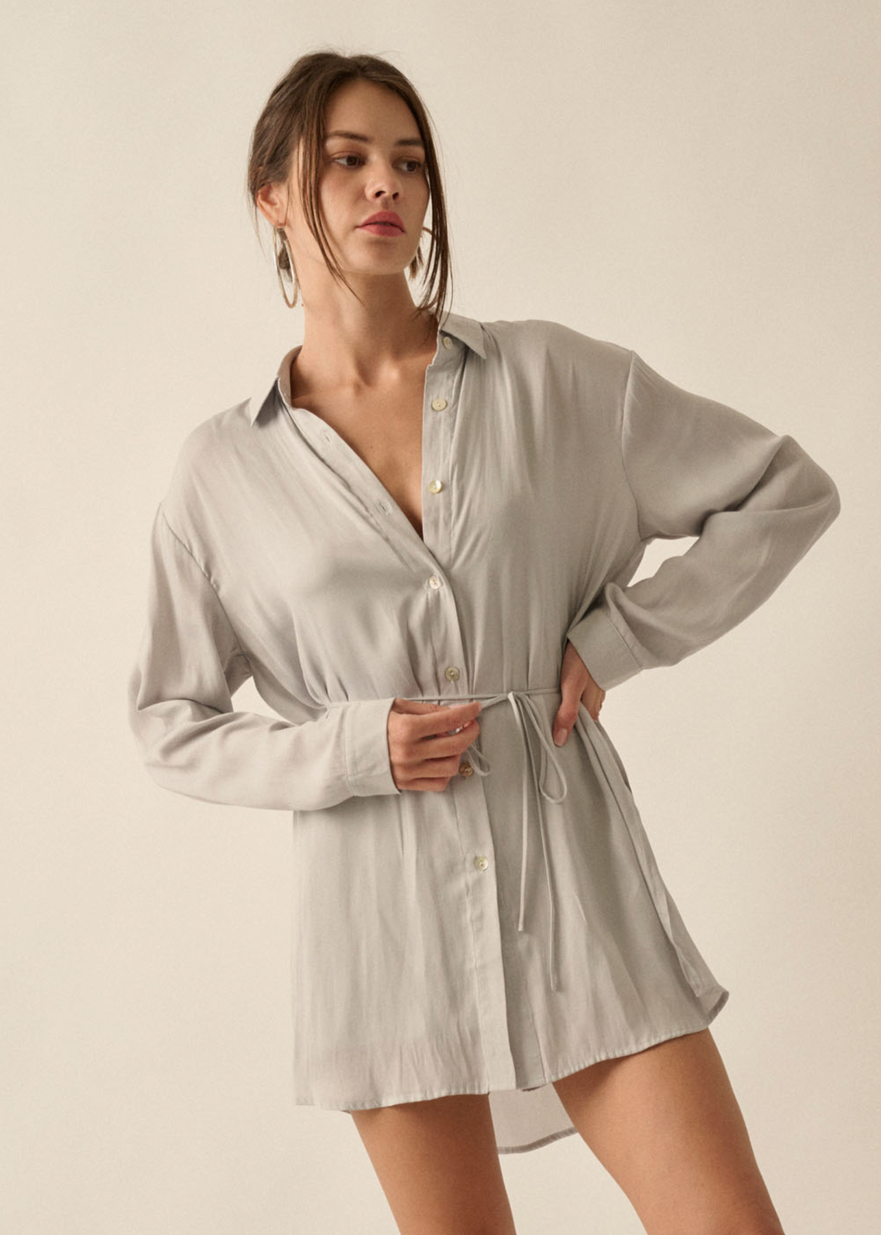 An elevated take on effortless dressing, this satin romper features a layered design that gives the illusion of a classic button-down shirt styled over tailored shorts. Crafted in a smooth, solid satin finish, it features a collared neckline, drop shoulders, and long sleeves with buttoned cuffs for a relaxed yet refined silhouette. The removable tie belt defines the waist, while subtle side slits and a curved shirttail hem add movement and dimension. Designed with a yoke back and thigh-length cut, this piece offers a comfortable relaxed fit with a polished feel.